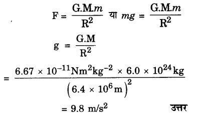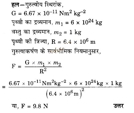 पृथ्वी तथा उसकी सतह पर रखी किसी 1 kg की वस्तु के बीच गुरुत्वीय बल का परिमाण क्या होगा? (पृथ्वी का द्रव्यमान 6 x 1024 kg है तथा पृथ्वी की त्रिज्या 6.4 x 106 m है)।